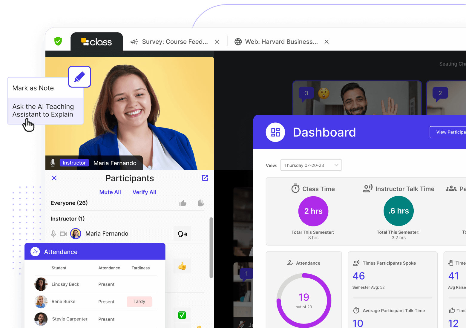 With Class’s enhanced LMS integration, seamlessly sync your course setup and materials with your preferred LMS. Centralize your course activities, attendance records, and assignment completion in one place, cultivating a cohesive learning environment where educators can focus on instruction and students can engage with course content without interruption.