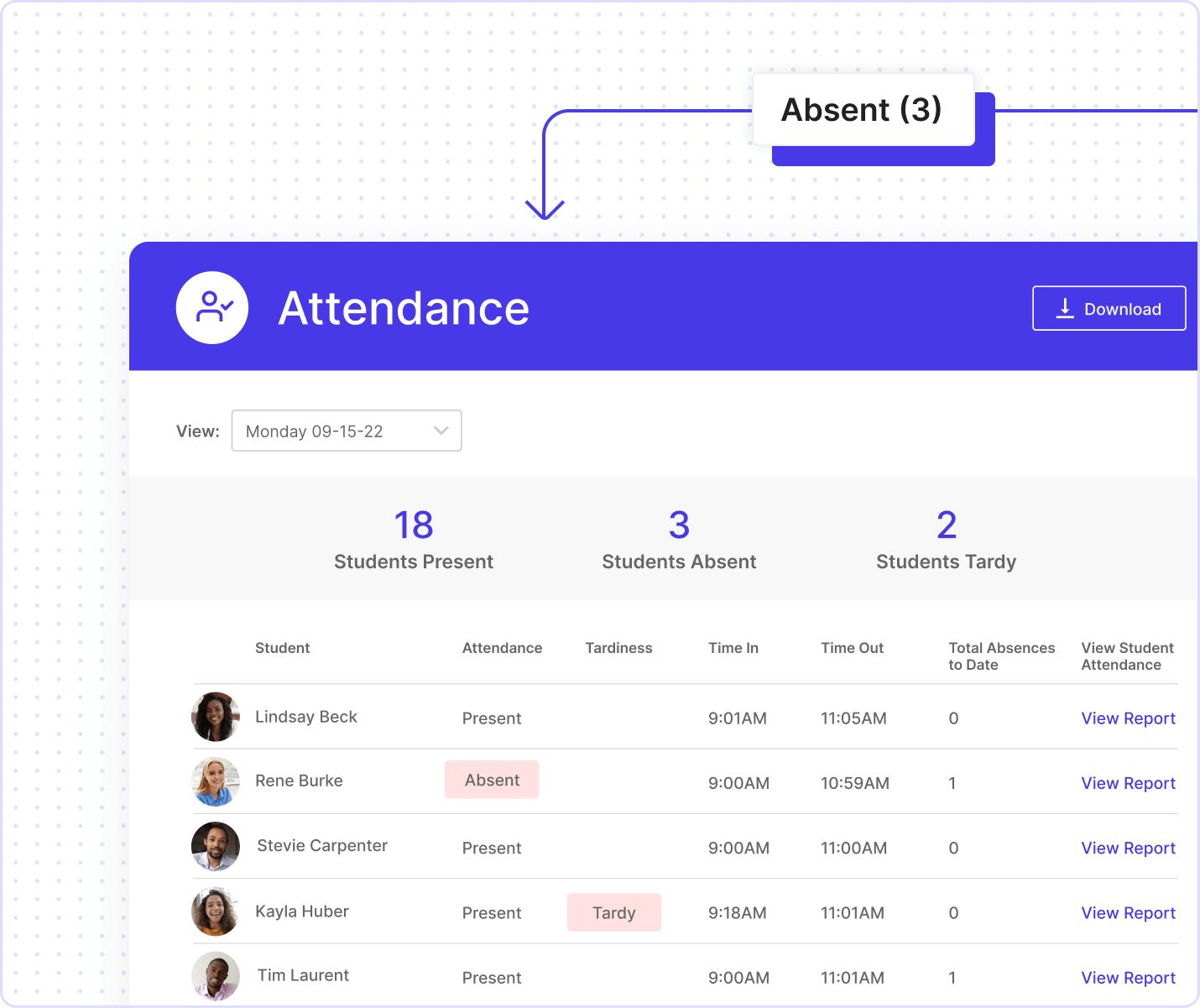 - Automatically record attendance and detailed tardiness information for every session