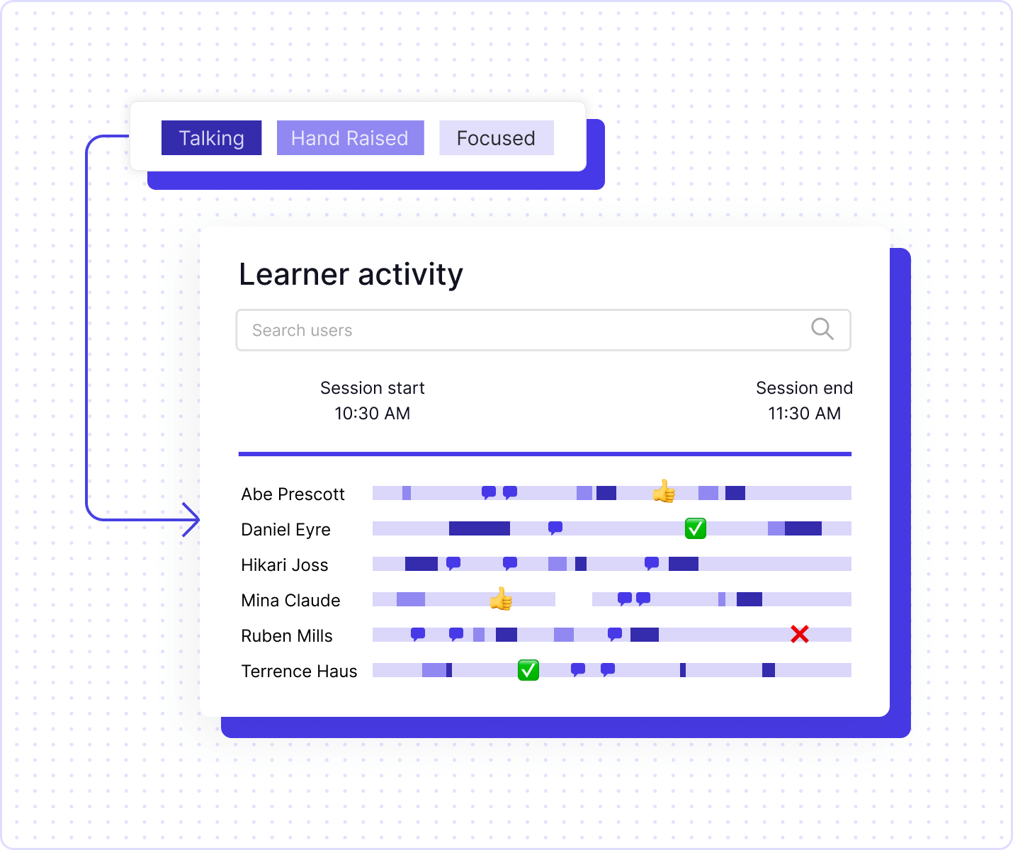Learner Engagement Scoring gives instructors a clear, data-driven view of engagement by analyzing key participation metrics—like talk time, chat activity, and reactions. With a real-time at-a-glance score, instructors can identify disengaged learners and take action in the moment, creating a more interactive and responsive learning experience for all learners.