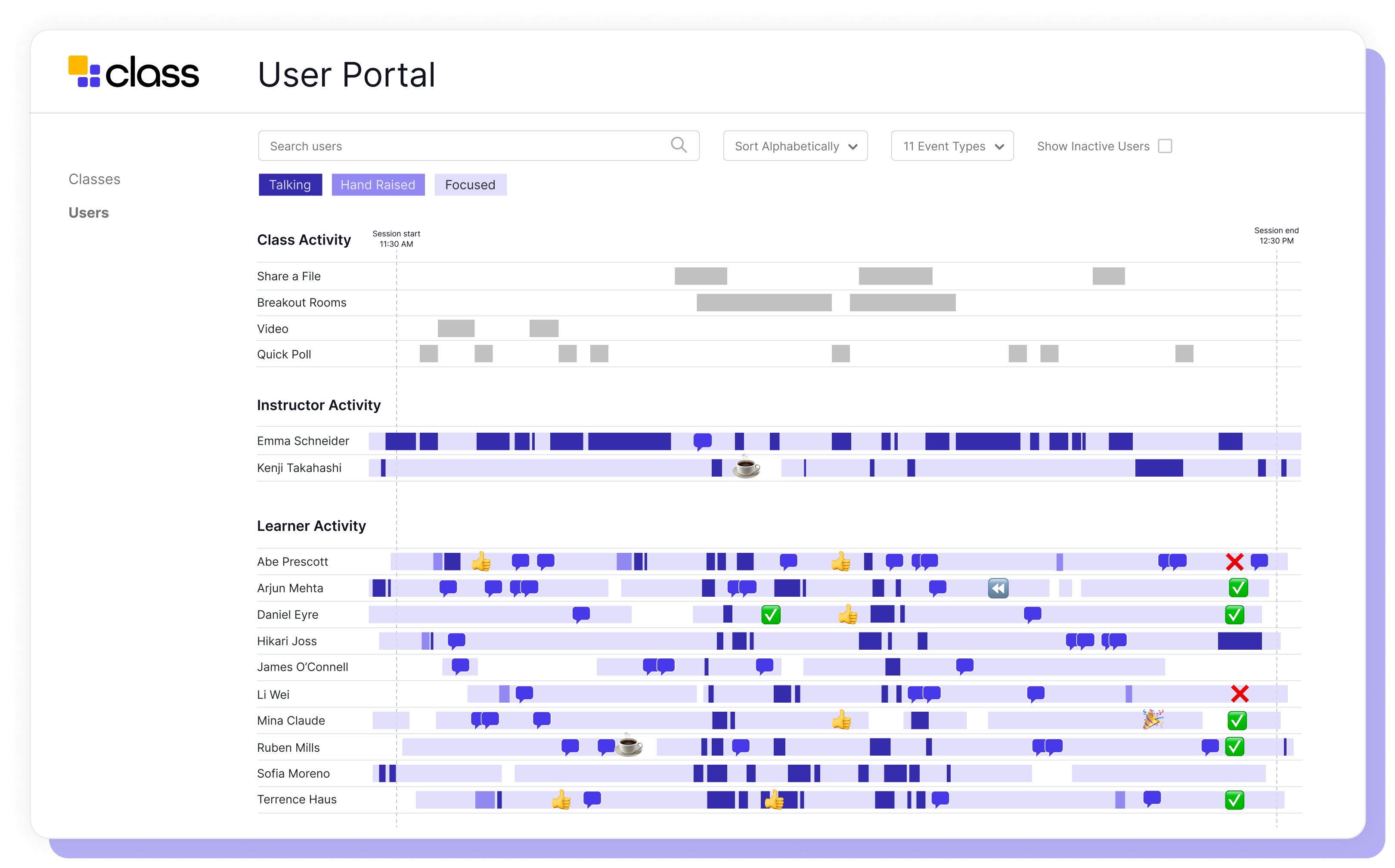 Learning analytics plays a critical role in helping educators, trainers, and organizations understand what’s working, spot when learners are struggling, and make timely, informed decisions. With Class, we’ve reimagined analytics for synchronous learning environments. Our platform not only shows you if learners are engaged, Class also helps you understand how they’re engaging, and what you can do to better support them.
