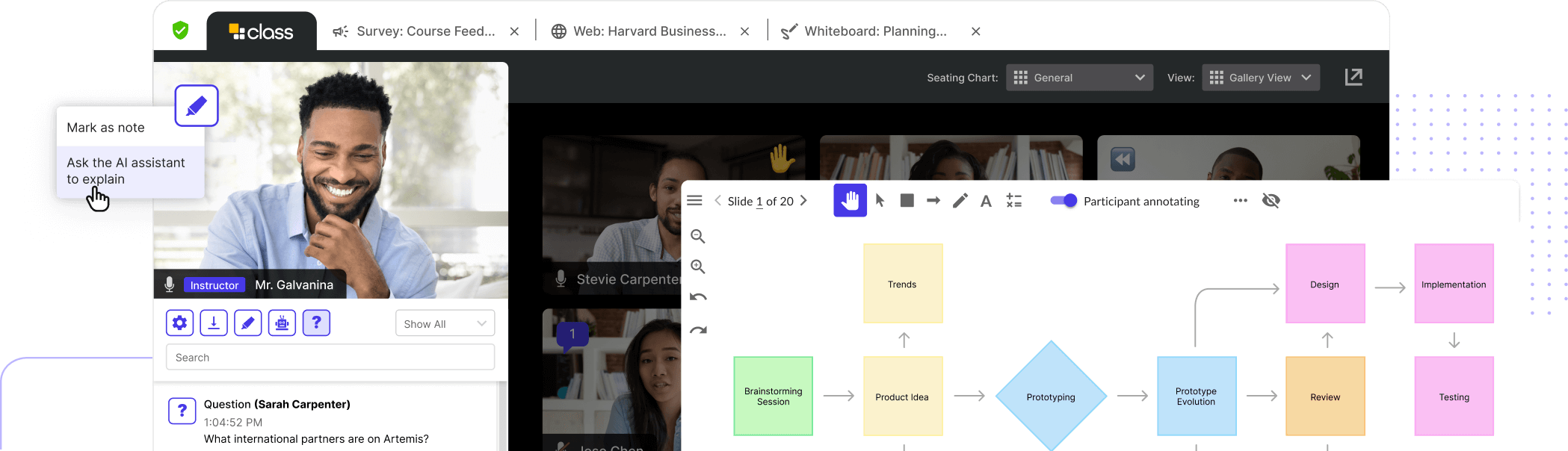With Class’s advanced presentation mode, course content is kept front-and-center, deepening learner focus and retention. Offering an all-in-one display purpose-built for live instruction and annotation support, instructors and learners can interact with and collaborate on content shared during live sessions.