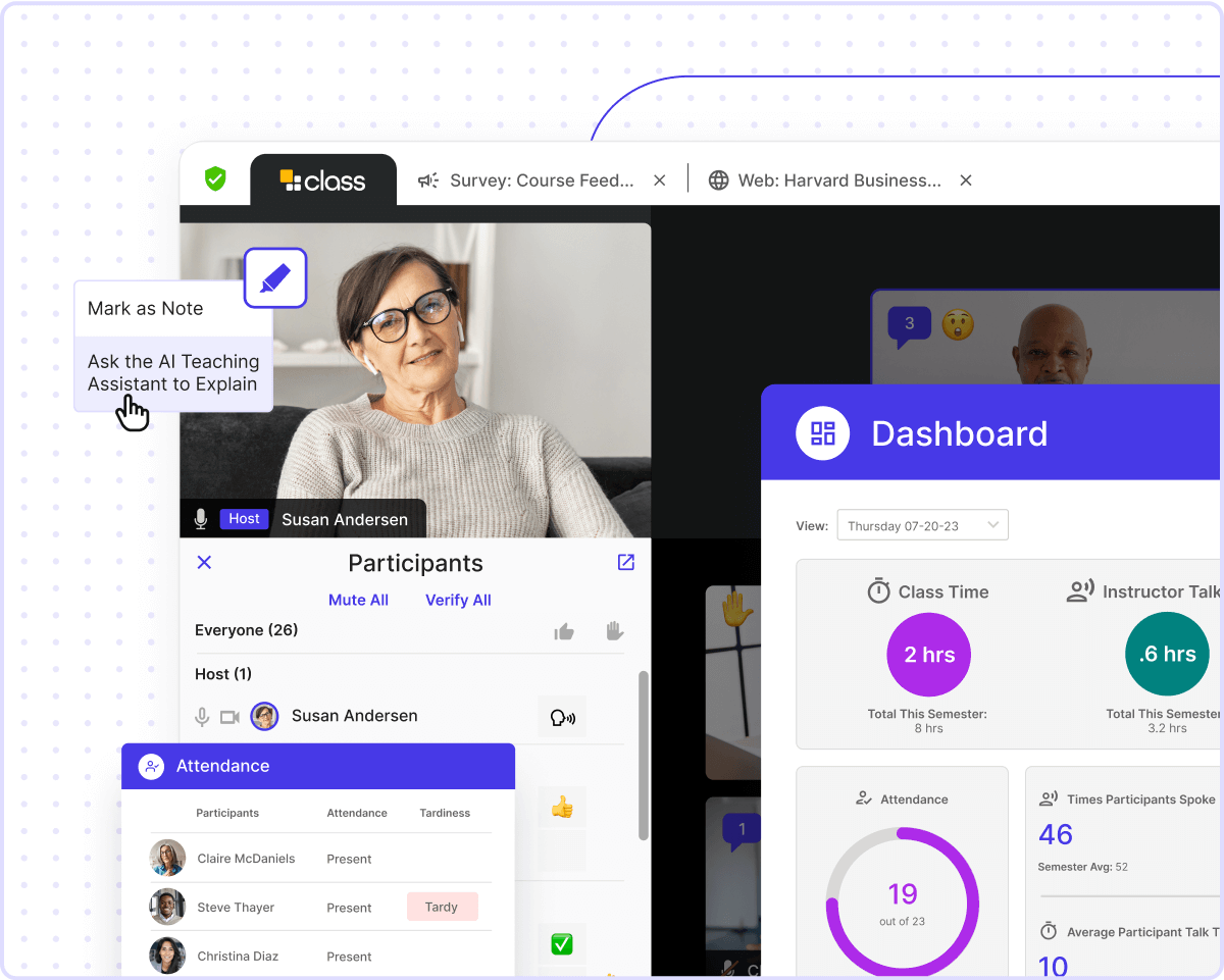 Engage learners, boost comprehension, and measure it all with Class’s powerful analytics. The real-time data dashboard tracks participation, engagement, and talk time. Monitor and report on session insights like attendance and course rosters to ensure regulatory compliance.