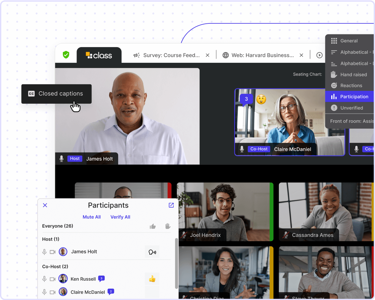 Class’s intuitive UI was designed to be easy to use and meet the needs of all participants. Seating charts keep instructors organized. Flexible layouts are customizable to meet individual needs.